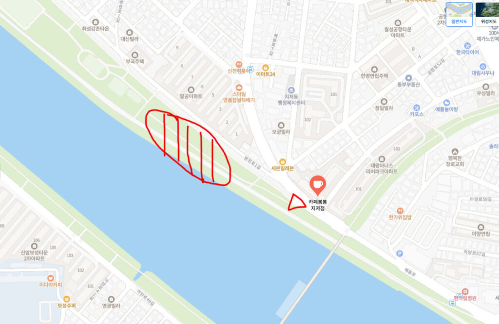 - 네비게이션: “카페봄봄 지저점” 검색하셔서 맞은편 금호강 쪽으로 내려가야 합니다.